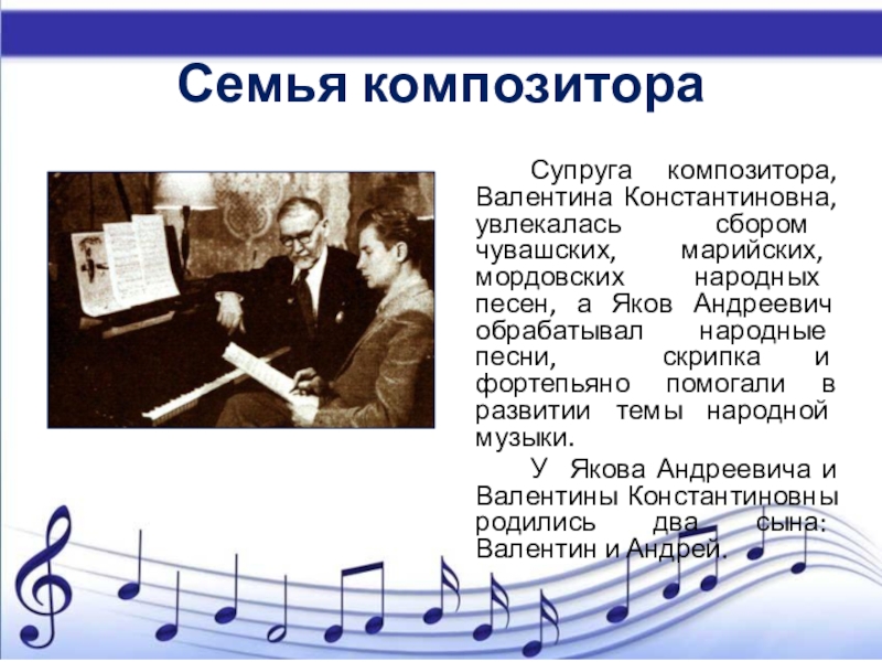 песен, а Яков Андреевич обрабатывал народные песни, скрипка и фортепьяно помогали в развитии темы народной музыки.