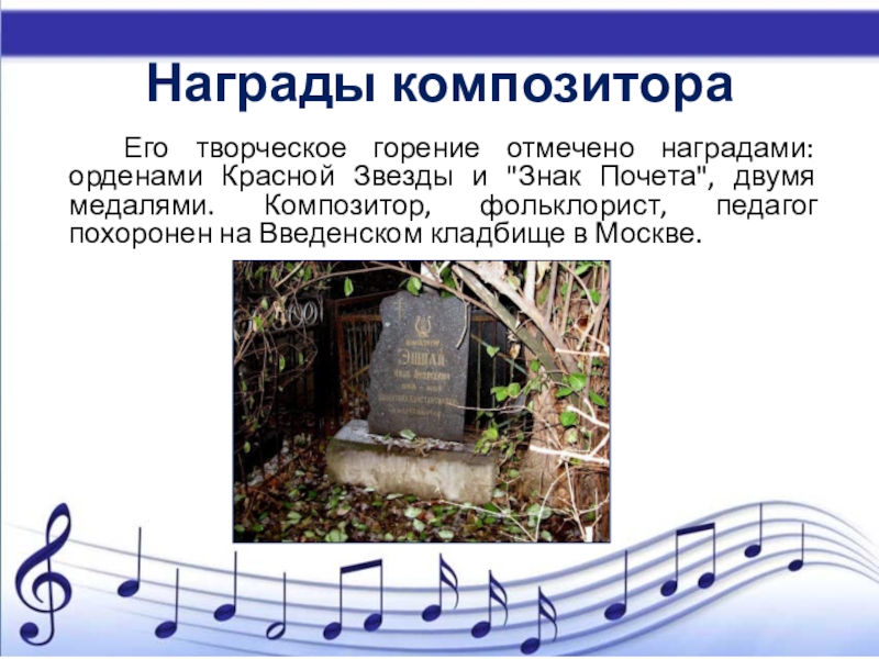 Красной Звезды и "Знак Почета", двумя медалями. Композитор, фольклорист, педагог похоронен на Введенском кладбище в Москве.