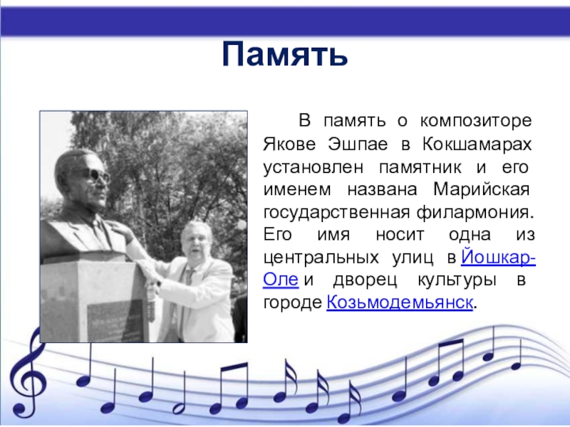 В память о композиторе Якове Эшпае в Кокшамарах установлен