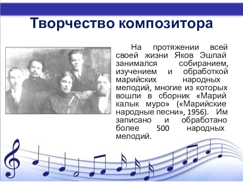 и обработкой марийских народных мелодий, многие из которых вошли в сборник «Марий калык муро» («Марийские народные песни», 1956). Им записано и обработано более 500 народных мелодий.