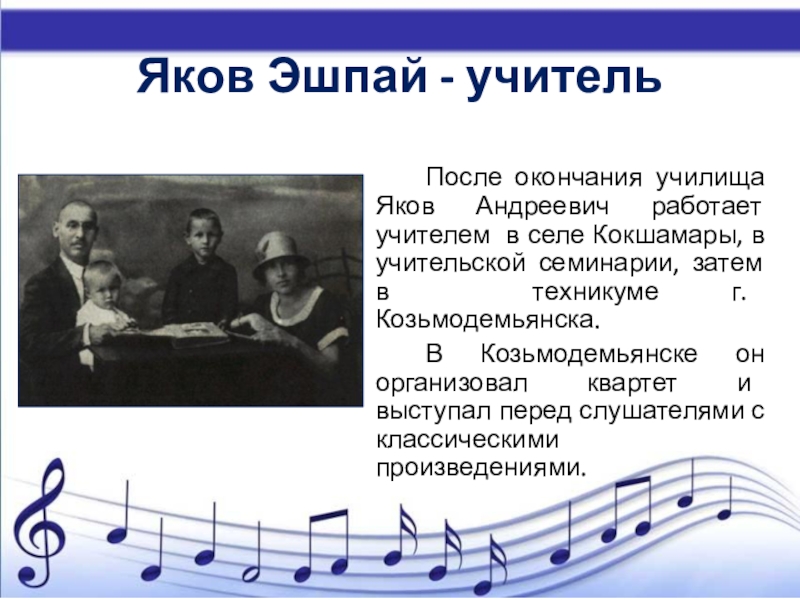 Московскую консерваторию. Тут он серьезно занимается композицией и работает как исследователь родной марийской музыки. В годы войны, когда на фронте погиб старший сын, Яков Эшпай пишет диссертацию о марийских народных инструментах.