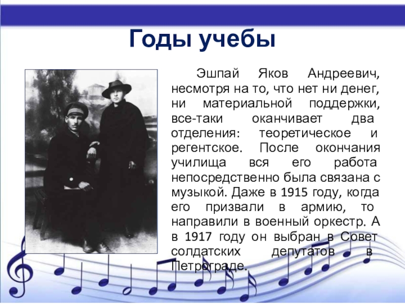 ни материальной поддержки, все-таки оканчивает два отделения: теоретическое и регентское. После окончания училища вся его работа непосредственно была связана с музыкой. Даже в 1915 году, когда его призвали в армию, то направили в военный оркестр. А в 1917 году он выбран в Совет солдатских депутатов в Петрограде.
