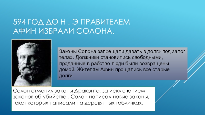 Законы Солона запрещали давать в долг» под залог тела». Должники становились свободными, проданные в рабство люди были возвращены домой. Жителям Афин прощались все старые долги.