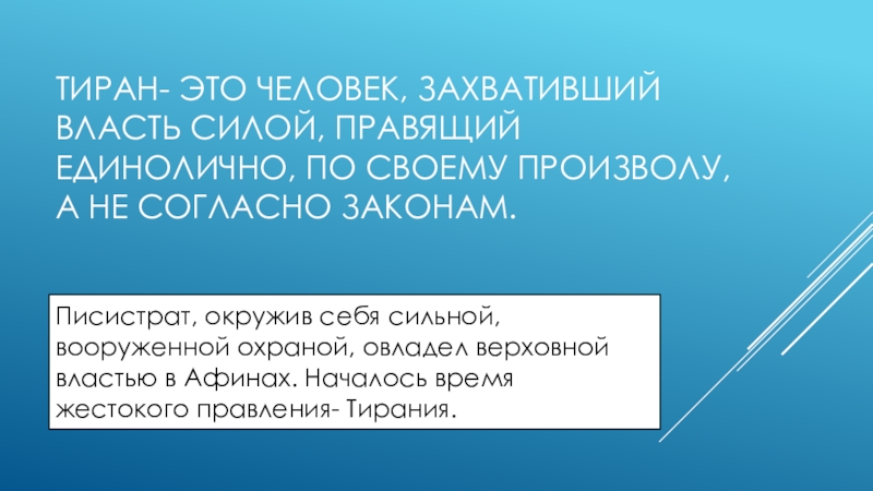 Писистрат, окружив себя сильной, вооруженной охраной, овладел верховной властью в Афинах. Началось время жестокого правления- Тирания.