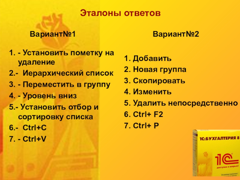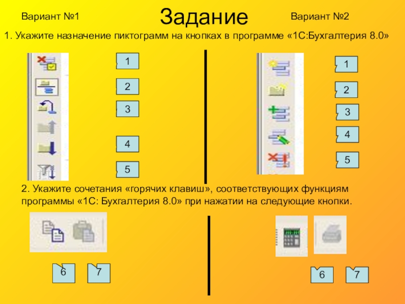 2. Укажите сочетания «горячих клавиш», соответствующих функциям программы «1С: Бухгалтерия 8.0» при нажатии на следующие кнопки.