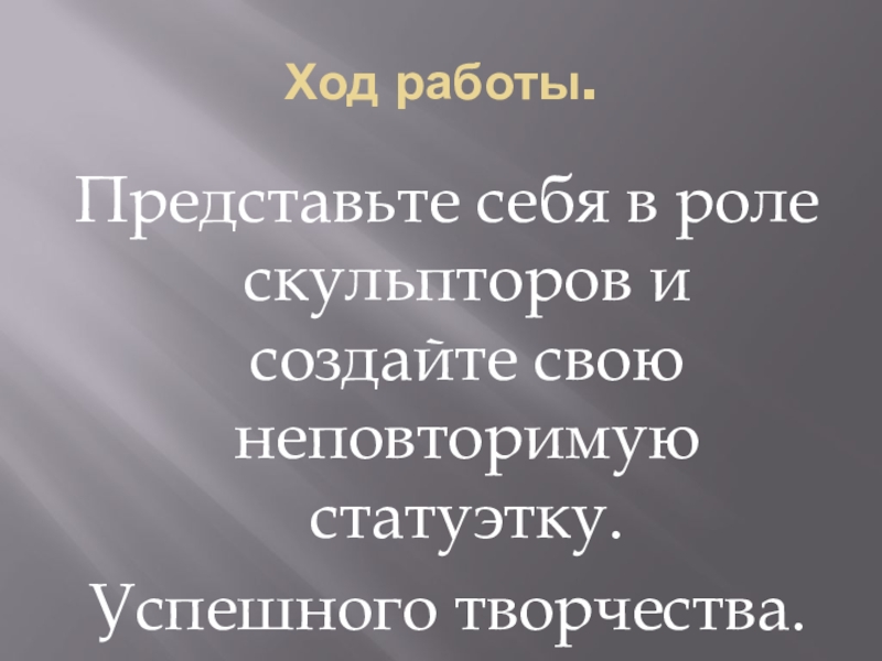 Ход работы.Представьте себя в роле скульпторов и создайте свою неповторимую статуэтку. Успешного творчества.