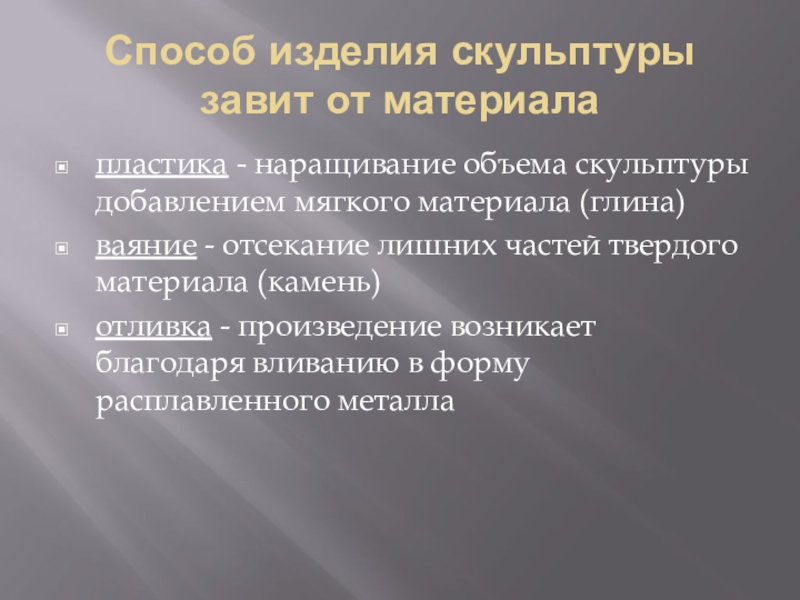 Способ изделия скульптуры завит от материалапластика - наращивание объема скульптуры добавлением мягкого материала (глина)ваяние - отсекание лишних