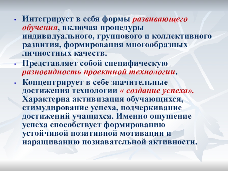Концентрирует в себе значительные достижения технологии « создание успеха». Характерна активизация обучающихся, стимулирование успеха, подчеркивание достижений учащихся. Именно ощущение успеха способствует формированию устойчивой позитивной мотивации и наращиванию познавательной активности.