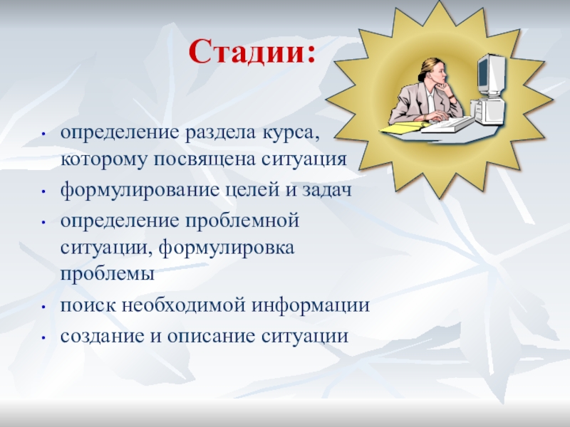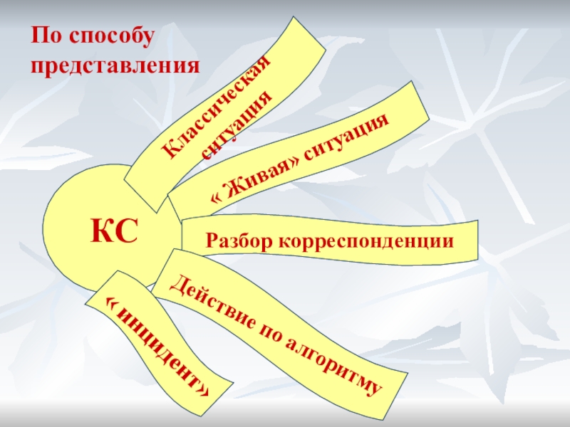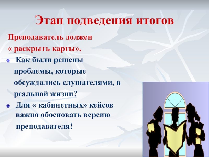 качестве факта или примера приводит конкретную ситуацию, предлагая решить ее. Преподаватель сам анализирует данную ситуацию и предлагает правильный вариант решения.