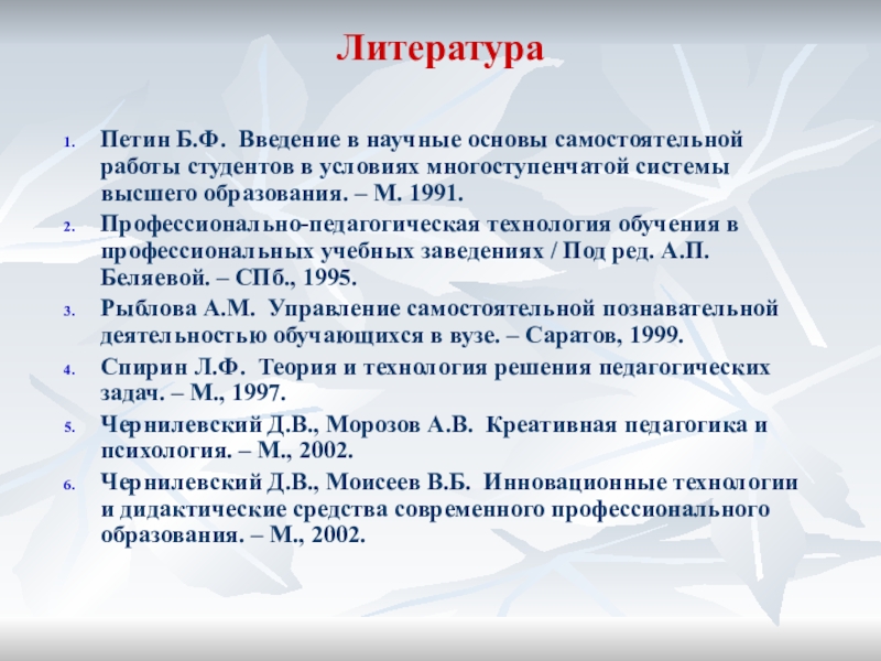 Рыблова А.М. Управление самостоятельной познавательной деятельностью обучающихся в вузе. – Саратов, 1999.