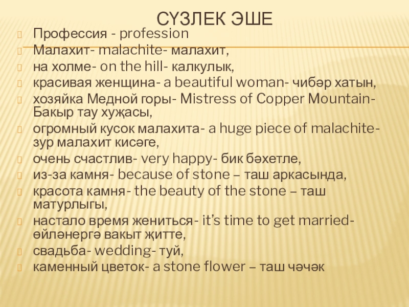 Cүзлек эшеПрофессия - professionМалахит- malachite- малахит, на холме- on the hill- калкулык, красивая женщина- a beautiful woman-