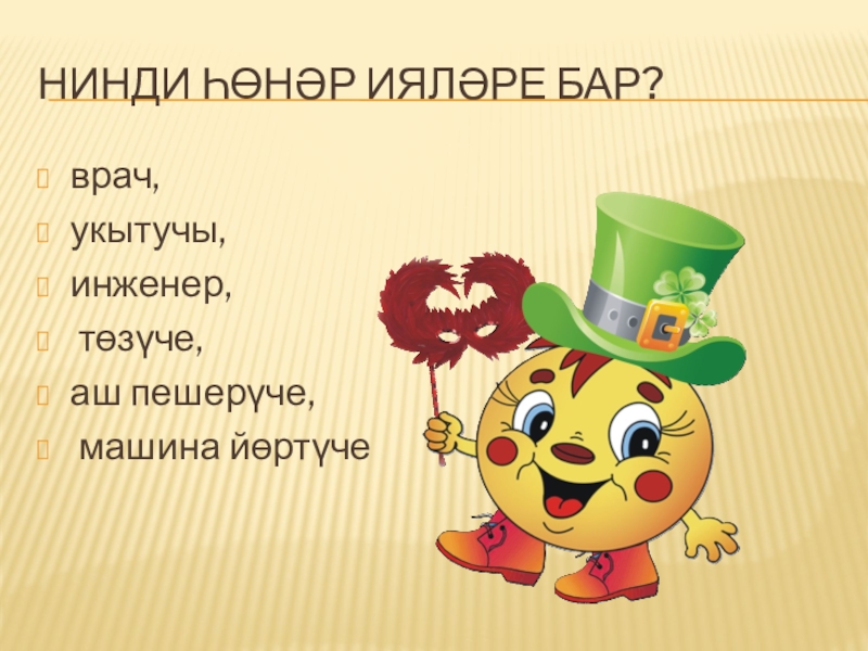 Нинди һөнәр ияләре бар?врач,укытучы, инженер, төзүче, аш пешерүче, машина йөртүче
