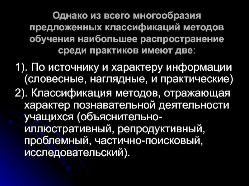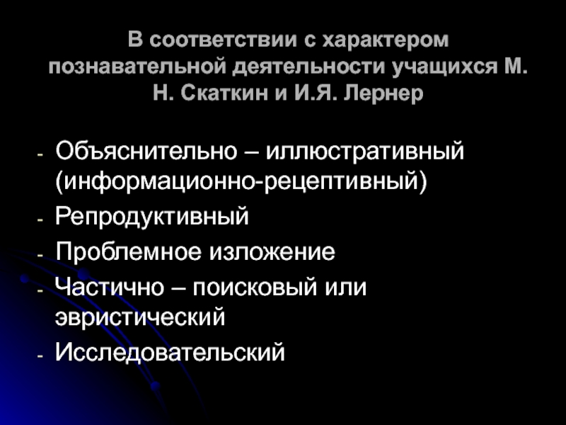 2). Классификация методов, отражающая характер познавательной деятельности учащихся (объяснительно-иллюстративный, репродуктивный, проблемный, частично-поисковый, исследовательский).