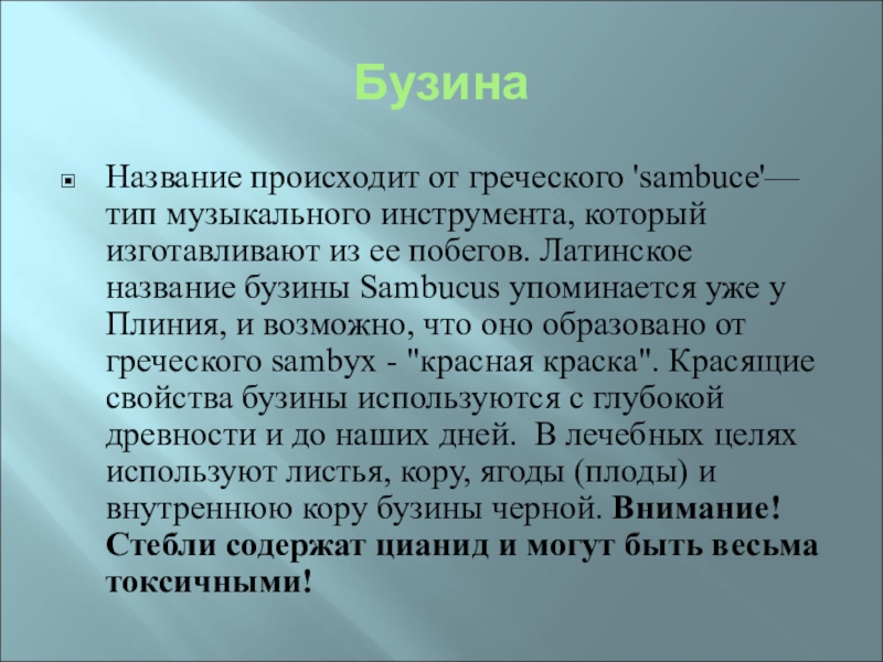 ее побегов. Латинское название бузины Sambucus упоминается уже у Плиния, и возможно, что оно образовано от греческого sambyx - "красная краска". Красящие свойства бузины используются с глубокой древности и до наших дней. В лечебных целях используют листья, кору, ягоды (плоды) и внутреннюю кору бузины черной. Внимание! Стебли содержат цианид и могут быть весьма токсичными!