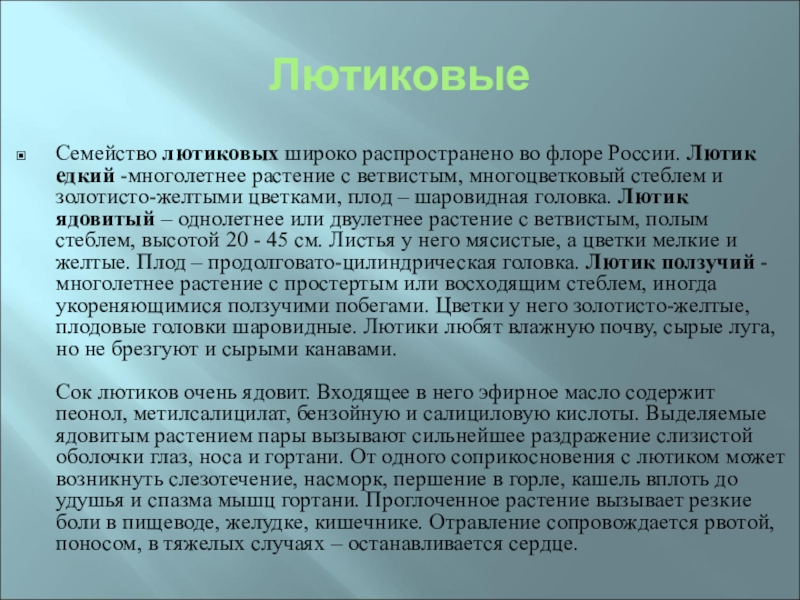 Семейство лютиковых широко распространено во флоре России. Лютик едкий -многолетнее растение