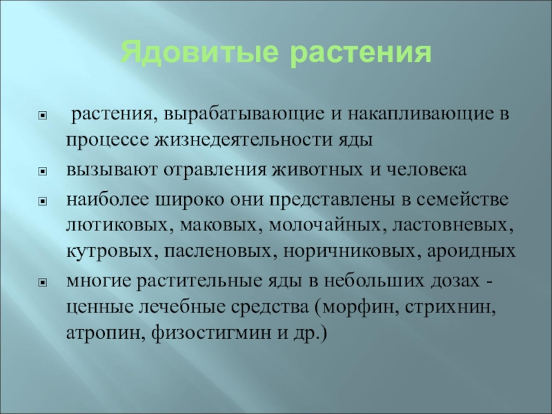 многие растительные яды в небольших дозах - ценные лечебные средства (морфин, стрихнин, атропин, физостигмин и др.)