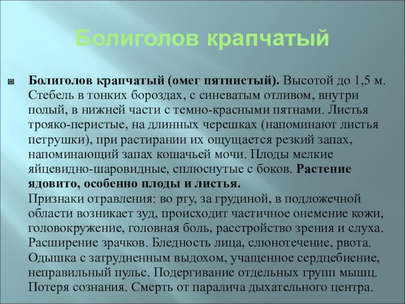 Признаки отравления наступают через 1-2 часа, напоминают признаки отравления болиголовом.