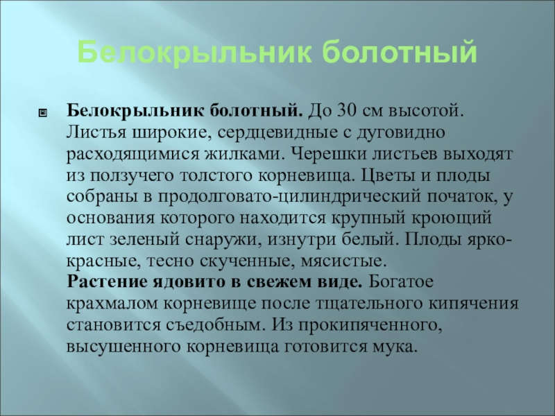 Белокрыльник болотный. До 30 см высотой. Листья широкие, сердцевидные с
