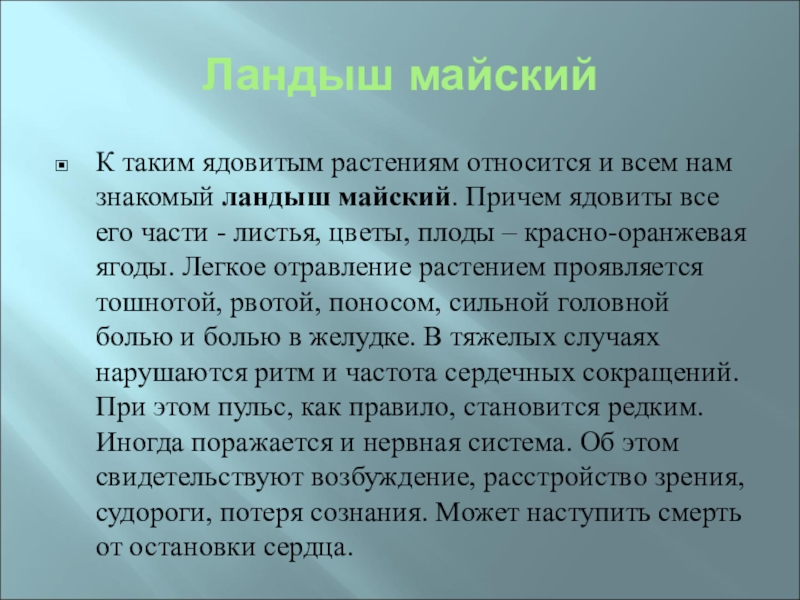 майский. Причем ядовиты все его части - листья, цветы, плоды – красно-оранжевая ягоды. Легкое отравление растением проявляется тошнотой, рвотой, поносом, сильной головной болью и болью в желудке. В тяжелых случаях нарушаются ритм и частота сердечных сокращений. При этом пульс, как правило, становится редким. Иногда поражается и нервная система. Об этом свидетельствуют возбуждение, расстройство зрения, судороги, потеря сознания. Может наступить смерть от остановки сердца.