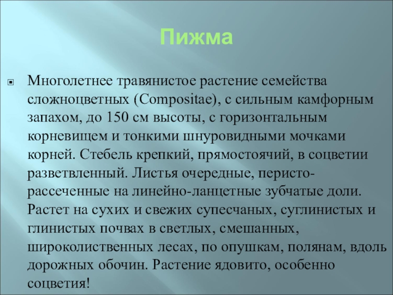 Многолетнее травянистое растение семейства сложноцветных (Compositae), с сильным камфорным запахом, до