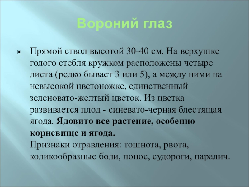 расположены четыре листа (редко бывает 3 или 5), а между ними на невысокой цветоножке, единственный зеленовато-желтый цветок. Из цветка развивается плод - синевато-черная блестящая ягода. Ядовито все растение, особенно корневище и ягода.