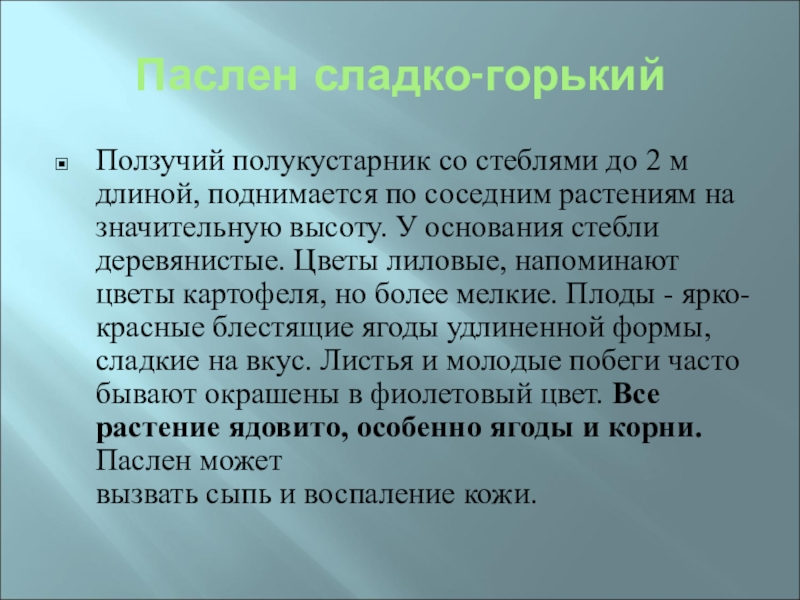 соседним растениям на значительную высоту. У основания стебли деревянистые. Цветы лиловые, напоминают цветы картофеля, но более мелкие. Плоды - ярко-красные блестящие ягоды удлиненной формы, сладкие на вкус. Листья и молодые побеги часто бывают окрашены в фиолетовый цвет. Все растение ядовито, особенно ягоды и корни. Паслен может