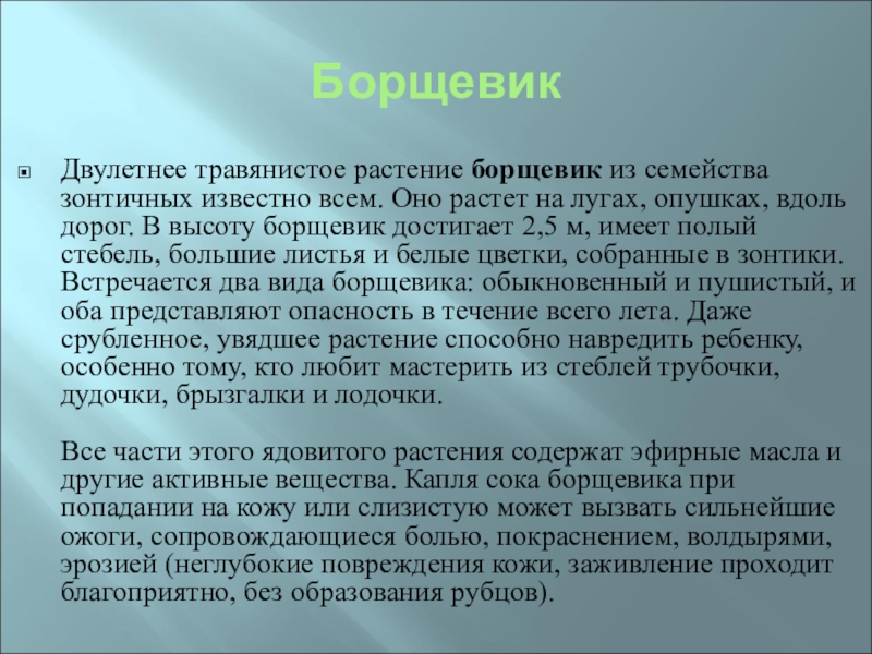 Все части этого ядовитого растения содержат эфирные масла и другие активные вещества. Капля сока борщевика при попадании на кожу или слизистую может вызвать сильнейшие ожоги, сопровождающиеся болью, покраснением, волдырями, эрозией (неглубокие повреждения кожи, заживление проходит благоприятно, без образования рубцов).