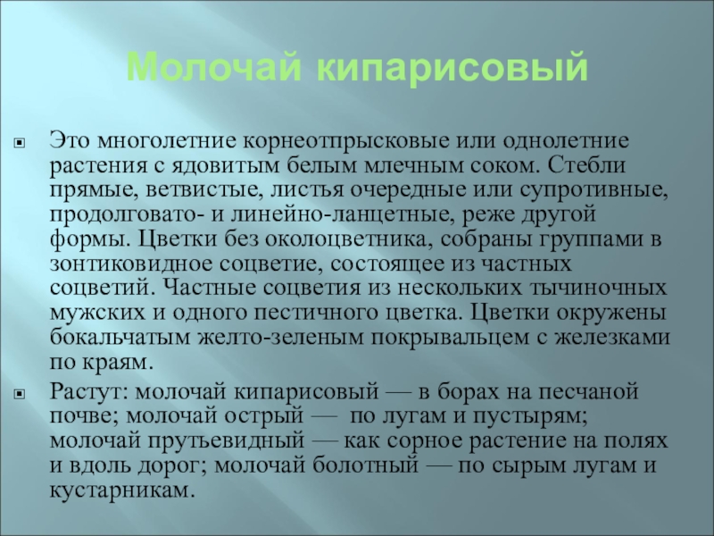 Это многолетние корнеотпрысковые или однолетние растения с ядовитым белым млечным