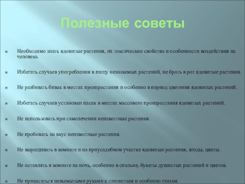 Избегать случаев употребления в пищу незнакомых растений, не брать в рот ядовитые растения.