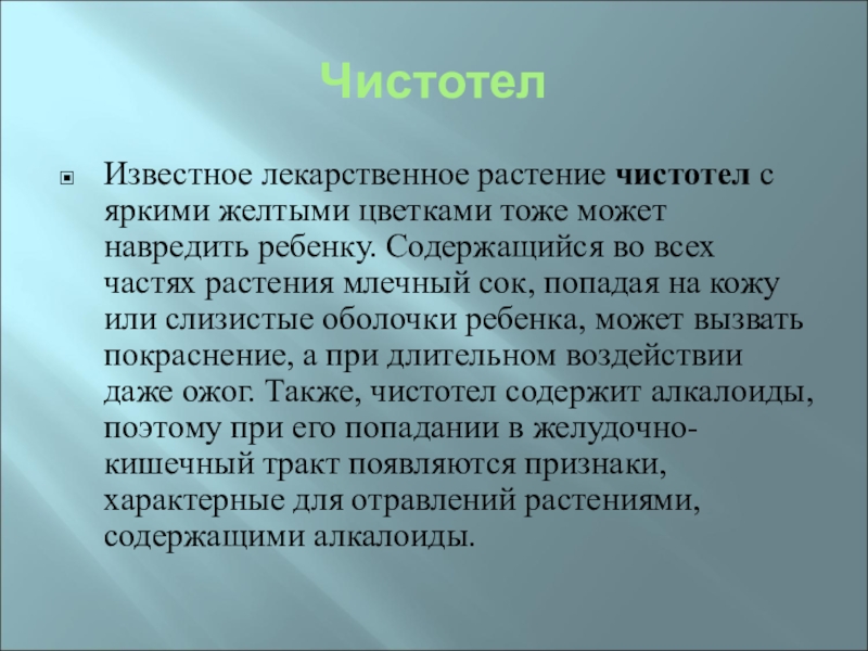 ребенку. Содержащийся во всех частях растения млечный сок, попадая на кожу или слизистые оболочки ребенка, может вызвать покраснение, а при длительном воздействии даже ожог. Также, чистотел содержит алкалоиды, поэтому при его попадании в желудочно-кишечный тракт появляются признаки, характерные для отравлений растениями, содержащими алкалоиды.