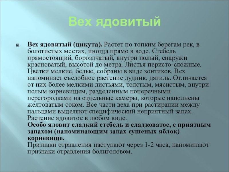 местах, иногда прямо в воде. Стебель прямостоящий, бороздчатый, внутри полый, снаружи красноватый, высотой до метра. Листья перисто-сложные. Цветки мелкие, белые, собраны в виде зонтиков. Вех напоминает съедобное растение дудник, дягиль. Отличается от них более мелкими листьями, толстым, мясистым, внутри полым корневищем, разделенным поперечными перегородками на отдельные камеры, которые наполнены желтоватым соком. Все части веха при растирании между пальцами выделяют специфический неприятный запах. Растение ядовитое в любом виде.