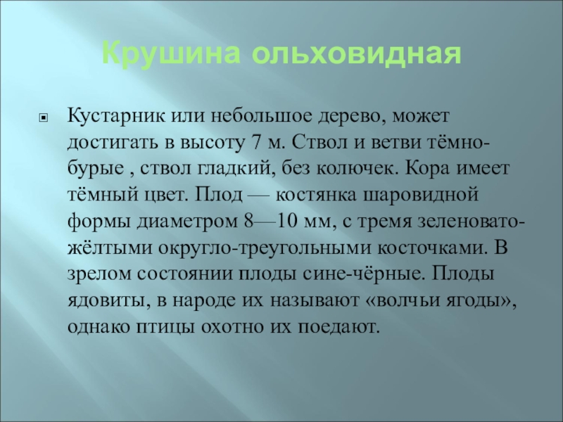 и ветви тёмно-бурые , ствол гладкий, без колючек. Кора имеет тёмный цвет. Плод — костянка шаровидной формы диаметром 8—10 мм, с тремя зеленовато-жёлтыми округло-треугольными косточками. В зрелом состоянии плоды сине-чёрные. Плоды ядовиты, в народе их называют «волчьи ягоды», однако птицы охотно их поедают.