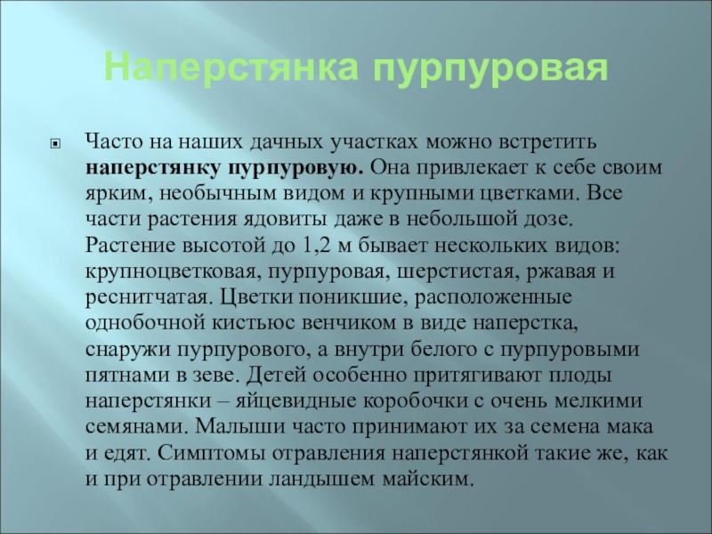 привлекает к себе своим ярким, необычным видом и крупными цветками. Все части растения ядовиты даже в небольшой дозе. Растение высотой до 1,2 м бывает нескольких видов: крупноцветковая, пурпуровая, шерстистая, ржавая и реснитчатая. Цветки поникшие, расположенные однобочной кистьюс венчиком в виде наперстка, снаружи пурпурового, а внутри белого с пурпуровыми пятнами в зеве. Детей особенно притягивают плоды наперстянки – яйцевидные коробочки с очень мелкими семянами. Малыши часто принимают их за семена мака и едят. Симптомы отравления наперстянкой такие же, как и при отравлении ландышем майским.