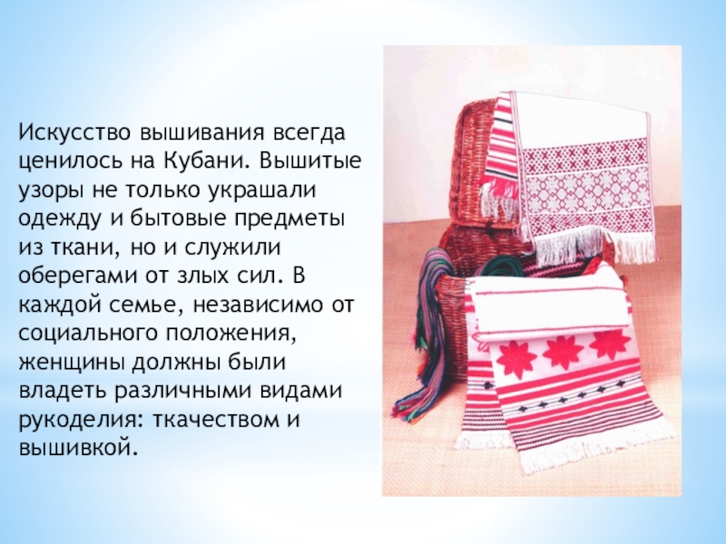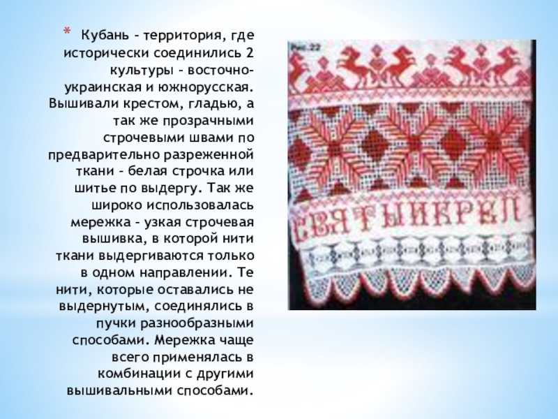 Кубань - территория, где исторически соединились 2 культуры – восточно-украинская и южнорусская. Вышивали крестом, гладью, а так
