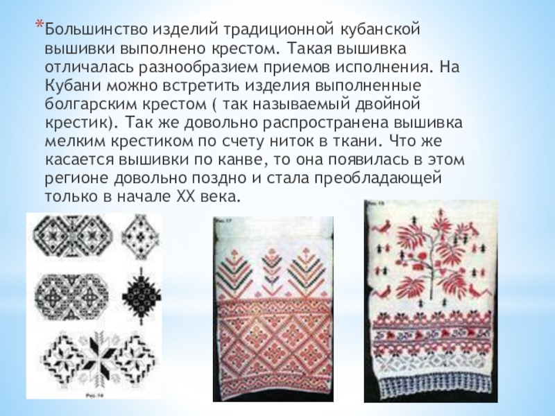 Большинство изделий традиционной кубанской вышивки выполнено крестом. Такая вышивка отличалась разнообразием приемов исполнения. На Кубани можно встретить