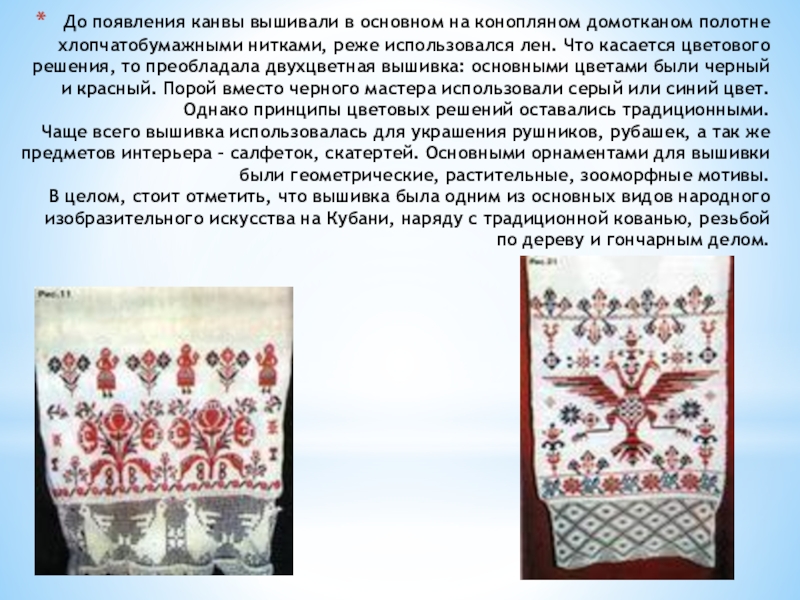 нитками, реже использовался лен. Что касается цветового решения, то преобладала двухцветная вышивка: основными цветами были черный и красный. Порой вместо черного мастера использовали серый или синий цвет. Однако принципы цветовых решений оставались традиционными. Чаще всего вышивка использовалась для украшения рушников, рубашек, а так же предметов интерьера – салфеток, скатертей. Основными орнаментами для вышивки были геометрические, растительные, зооморфные мотивы.  В целом, стоит отметить, что вышивка была одним из основных видов народного изобразительного искусства на Кубани, наряду с традиционной кованью, резьбой по дереву и гончарным делом.