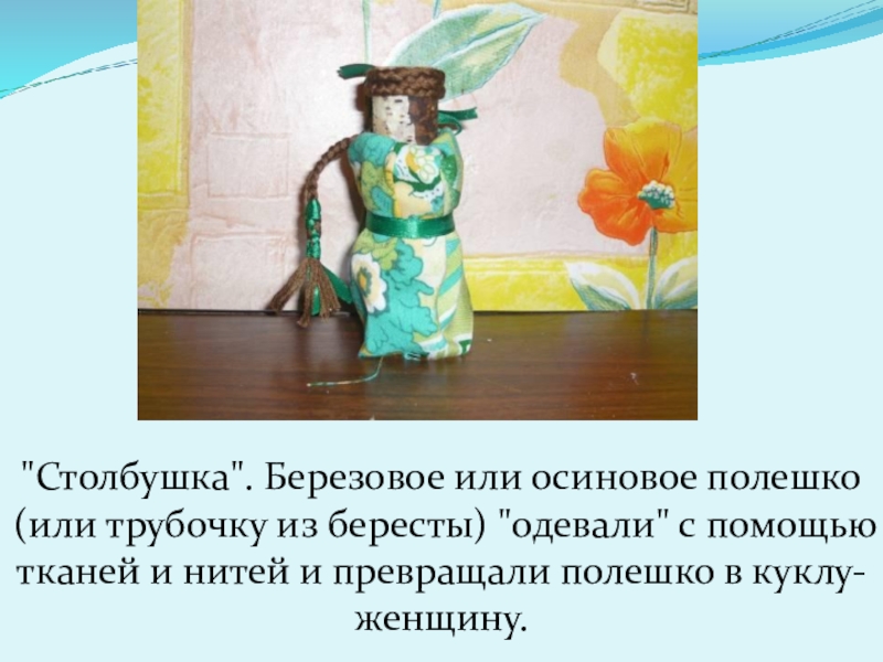 Слайд 12"Столбушка". Березовое или осиновое полешко (или трубочку из бересты) "одевали" с