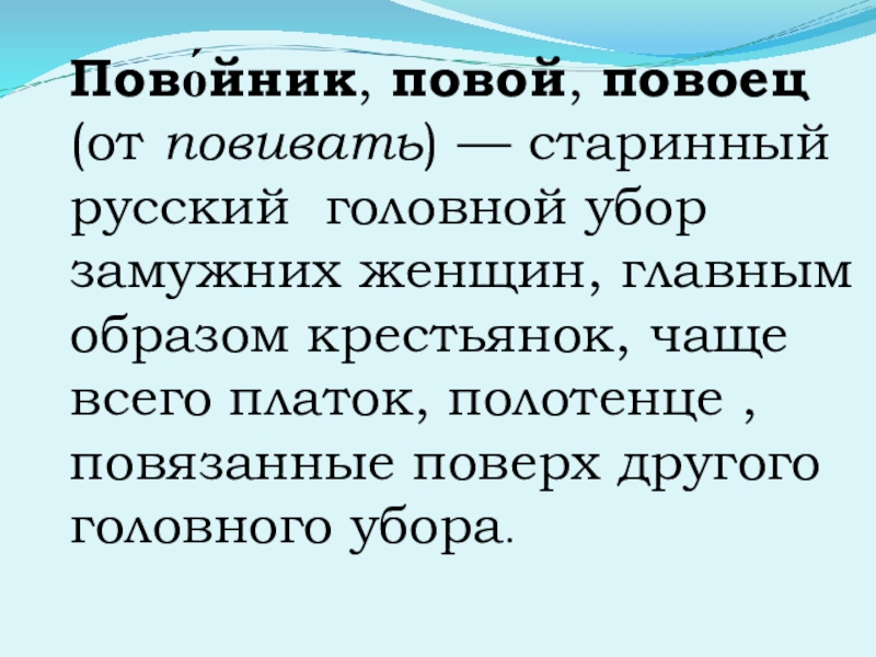 Слайд 15Пово́йник, повой, повоец (от повивать) — старинный русский головной убор замужних женщин,