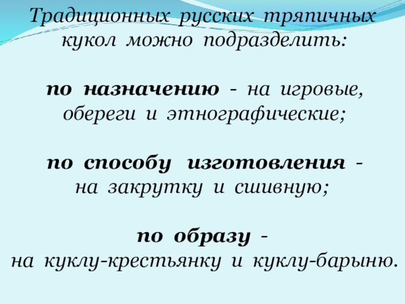 Традиционных русских тряпичных кукол можно подразделить:     по назначению - на игровые, обереги и