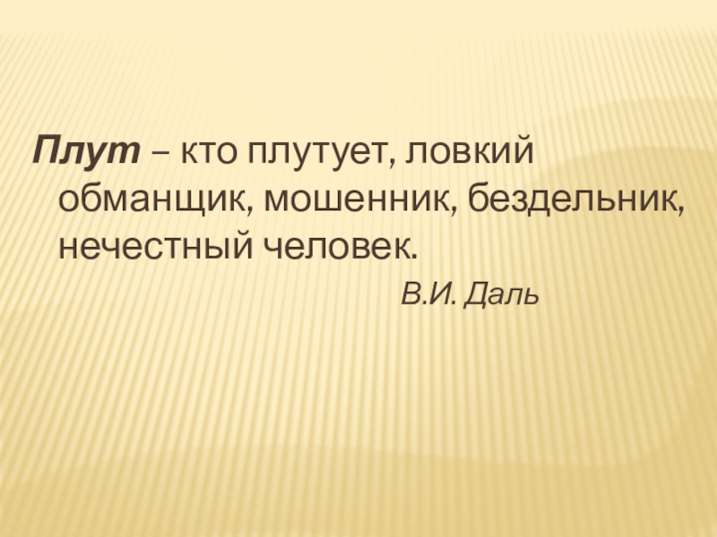 Слайд 4Плут – кто плутует, ловкий обманщик, мошенник, бездельник, нечестный человек.
