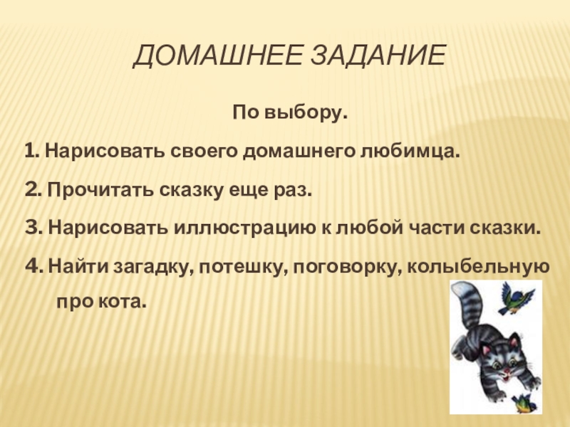 Домашнее заданиеПо выбору.1. Нарисовать своего домашнего любимца. 2. Прочитать сказку еще раз.3. Нарисовать иллюстрацию к любой части