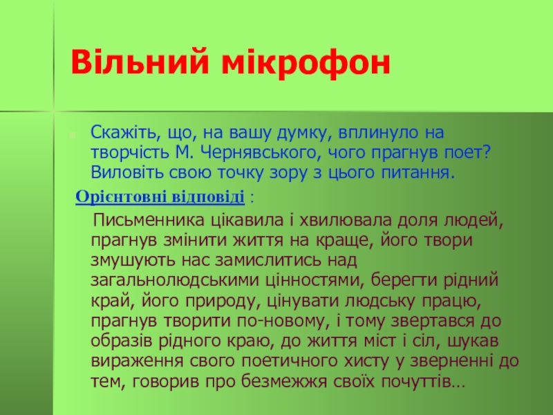 Метод “Вільний мікрофон” (Що, на вашу думку, вплинуло на творчість М.Чернявського? Чого прагнув поет? Висловіть свою думку.)