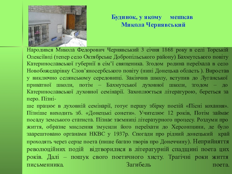 ше працює в духовній семінарії, готує першу збірку поезій «Пісні кохання». Пізніше виходить зб. «Донецькі сонети». Учителює 12 років, Потім займає посаду земського статиста. Пізнає таємниці літературного процесу. Роздуми про життя, образне мислення змусили його переїхати до Херсонщини, де було заарештовано органами НКВС у 1937р. Спогади про рідний донецький край проходять через серце поета (пише багато творів про Донеччину). Неприйняття революційних подій відтворилися в літературній спадщині поета цих років. Далі – пошук свого поетичного хисту. Трагічні роки життя письменника. Загибель поета.
