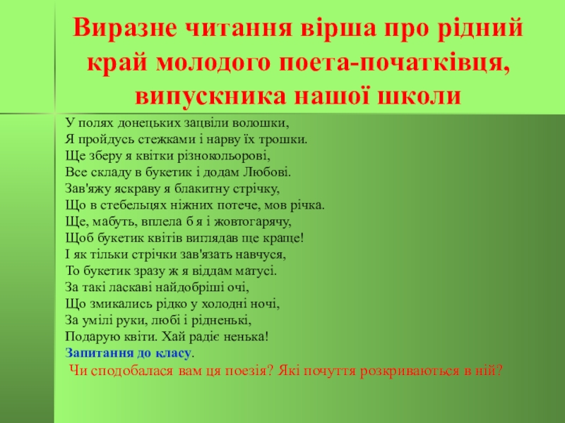 Слайд 21Виразне читання вірша про рідний край молодого поета-початківця, випускника нашої школи