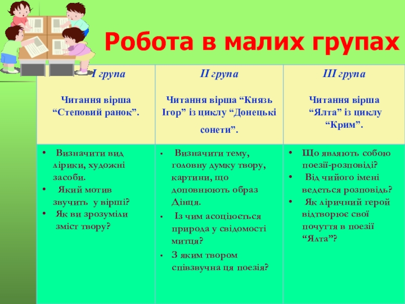 сенкана, словникова робота, літературний диктант, групова, індивідуальна, колективна робота, виразне читання, аналіз поезій.