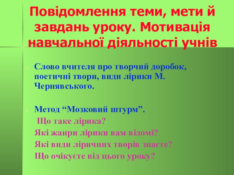 Слайд 9Повідомлення теми, мети й завдань уроку. Мотивація навчальної діяльності учнів