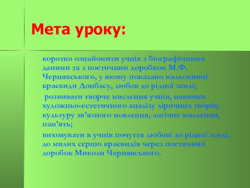 виховувати в учнів почуття любові до рідної землі, до милих серцю краєвидів через поетичний доробок Миколи Чернявського.