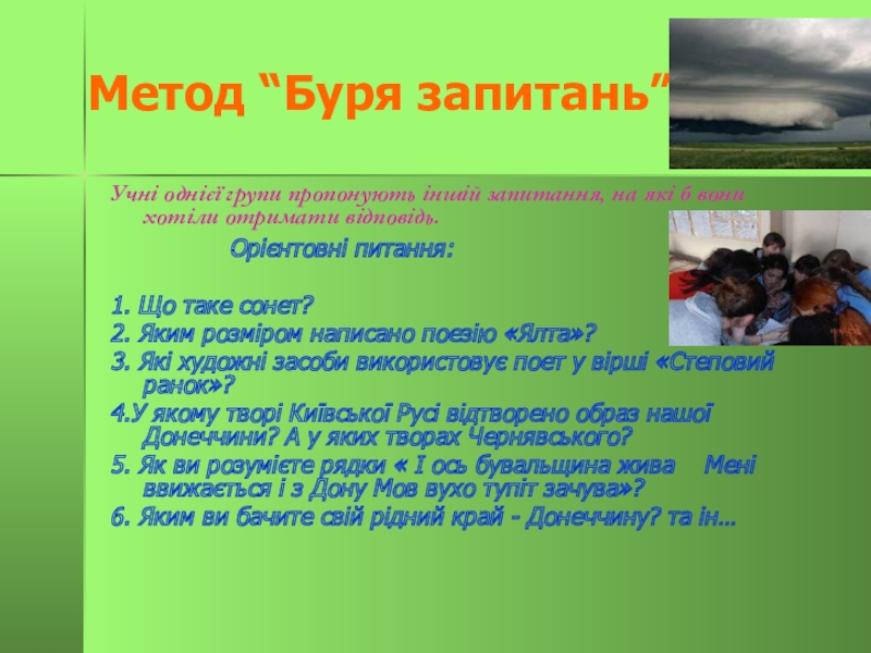 “Буря запитань”.(Обмін думками: кожна група ставить іншій кілька власних запитань).
