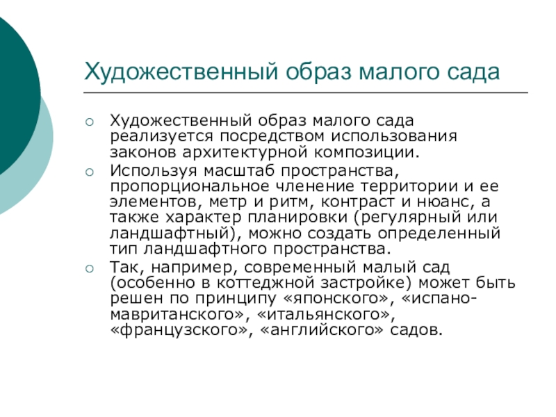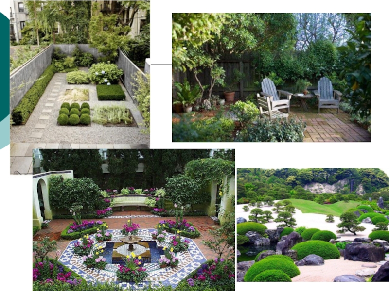 Так, например, современный малый сад (особенно в коттеджной застройке) может быть решен по принципу «японского», «испано-мавританского», «итальянского», «французского», «английского» садов.