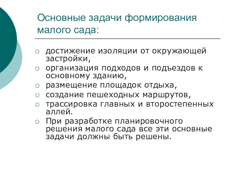 При разработке планировочного решения малого сада все эти основные задачи должны быть решены.